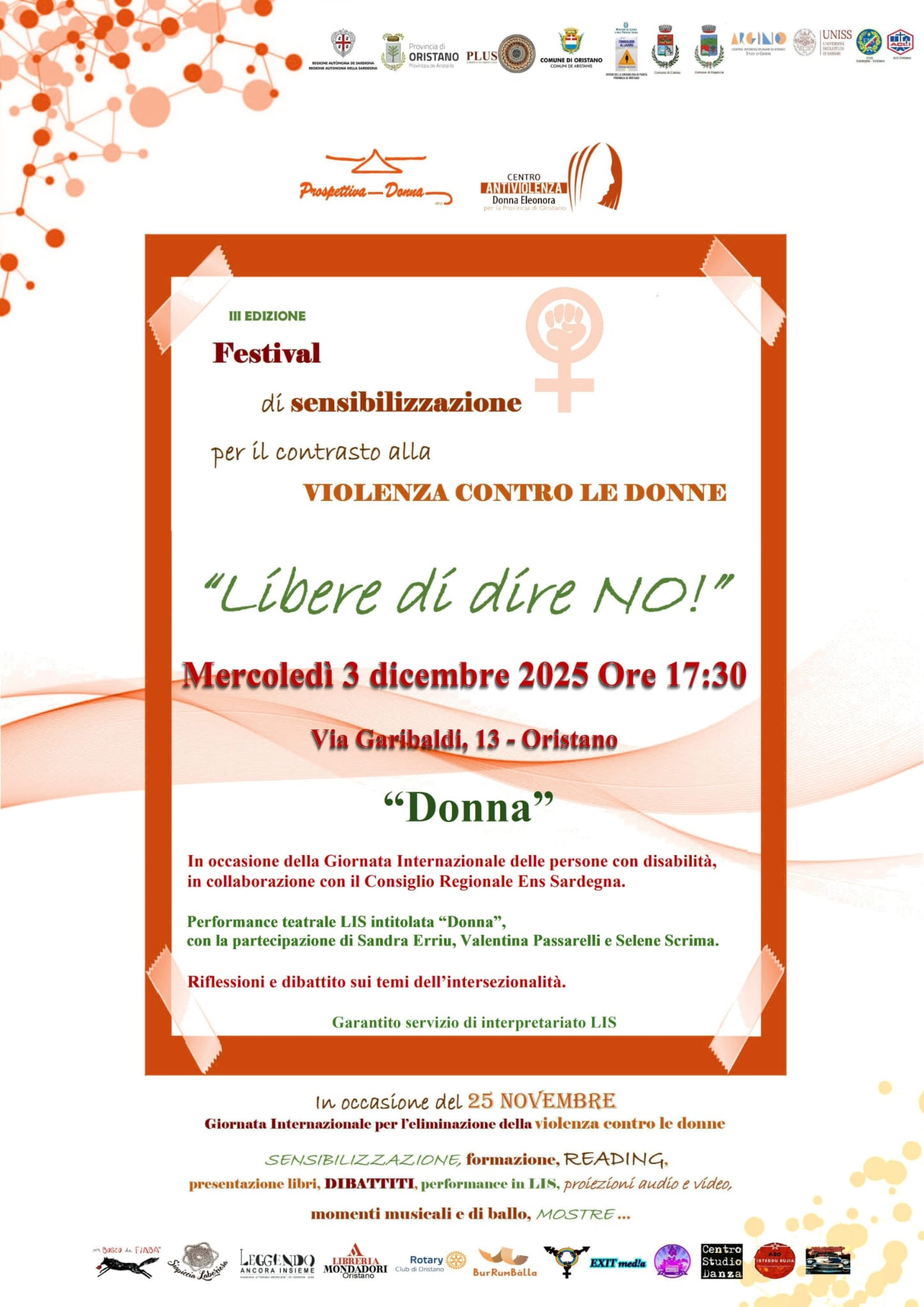 In occasione della Giornata Mondiale delle Persone con Disabilità, il 3 dicembre 2025 ad ORISTANO si è svolto un evento all’interno del “Festival di sensibilizzazione per il contrasto alla violenza contro le donne”, promosso dal Centro Antiviolenza Donna Eleonora, sostenuto dall’Ente Nazionale Sordi Consiglio Regionale in partner con Istituzioni Regionali e provinciali della Sardegna.