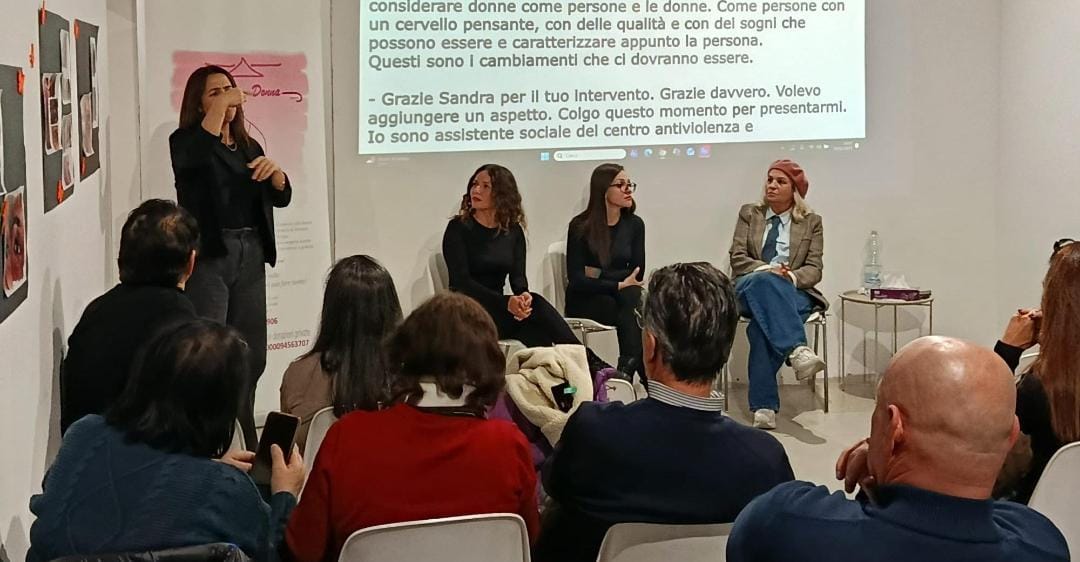 La giornata è stata arricchita dalla presenza della regista Sorda della compagnia teatrale palermitana “Il Ciclope” Sandra Erriu e di due attrici Sorde Valentina Passarelli e Selene Scrima, che hanno portato in scena uno spettacolo interamente in Lingua dei Segni Italiana (LIS). Attraverso una narrazione intensa, hanno invitato il pubblico a riflettere sugli stereotipi di genere, sulle diverse forme di violenza — non solo fisica, ma anche psicologica, economica e verbale — e sull’importanza del linguaggio: le parole contano e possono ferire, escludere o, al contrario, liberare.